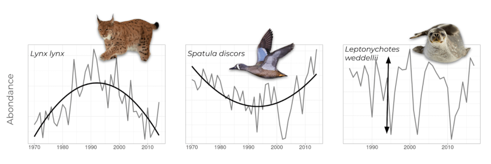 Dans la plupart des études, la dynamique des populations est résumée par une tendance simple : augmentation, déclin ou stabilité. Pourtant, une population peut croître puis s’effondrer (cas du lynx ci-dessous), décliner puis se rétablir (cas de la sarcelle ci-dessous), ou osciller dans le temps (cas du phoque). Ces trajectoires complexes sont invisibles dans les approches linéaires.